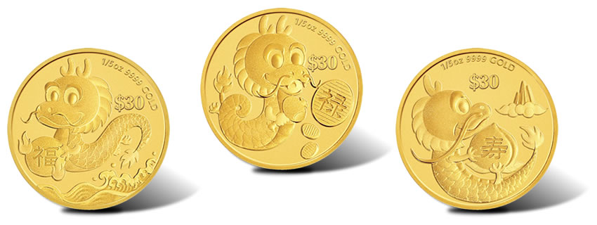 Available now from the Perth Mint of Australia are 2012 Year of the Dragon Gold Coins. These coins are issued by the Mint as a part of the Chinese Astrological Series and feature a dragon and the Chinese character for either prosperity, longevity or success — Fu, Lu and Shou.