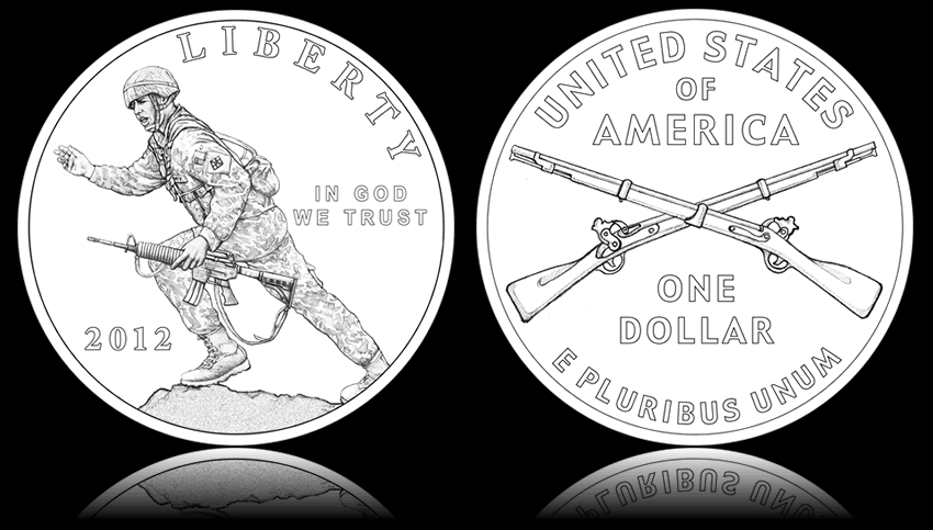In celebration of the history of the infantry soldier’s impact on U.S. history, the 2012 Infantry Soldier Silver Dollar obverse design features a modern Infantry soldier on rocky ground charging forward and beckoning the troops to follow, symbolizing the "Follow Me" motto of the Infantry. It was designed by (AIP) Master Designer Joel Iskowitz and engraved by U.S. Mint sculptor-engraver Michael Gaudioso. The reverse features the crossed rifles insignia of the Infantry as designed by AIP Associate Designer Ron Sanders and engraved by U.S. Mint sculptor-engraver Norman Nemeth.