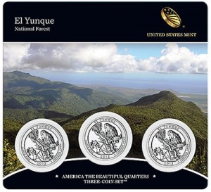 The included collector quality quarters share a reverse design that honors El Yunque National Forest of Puerto Rico located in the Caribbean. The three-coin set features:
