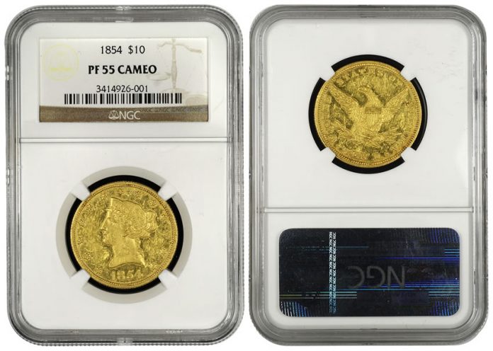 Numismatic Guaranty Corporation (NGC) recently identified and certified a proof 1854 $10 gold piece. The coin grades Proof 55 Cameo.