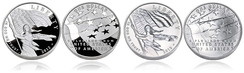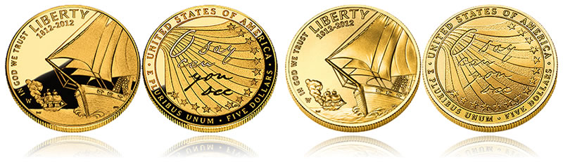 The 2012 Star-Spangled Banner Commemorative Coins celebrate the bicentennial writing of America’s national anthem by Francis Scott Key. The $5 gold coins and silver dollars bear designs emblematic of the War of 1812, with representations depicting a naval battle scene from the War of 1812, the Star-Spangled Banner anthem, Lady Liberty waiving a 15-star, 15-stripe Star-Spangled Banner flag and a waving modern American flag.