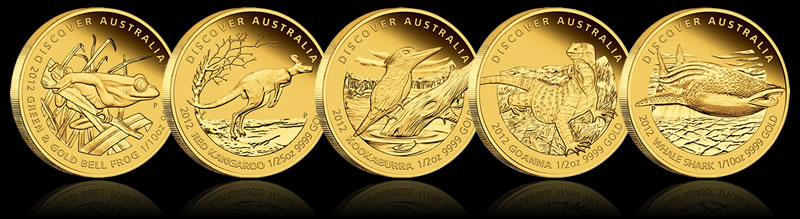 2012 Discover Australia Gold Proof Coins are now available from the Perth Mint of Australia with five unique reverse designs in three different sizes each struck from 99.99% pure gold.