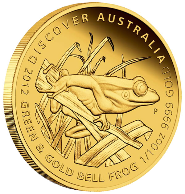 The reverse of the Green and Gold Bell Frog Gold Proof Coin shows the amphibian resting on reeds. An inscription indicating "GREEN AND GOLD BELL FROG" is shown along with "DISCOVER AUSTRALIA," "2012," "9999 GOLD," the size of the strike and the Perth Mint’s historic "P" mint mark.