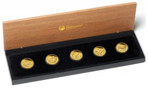 These strikes are also available as part of five-coin sets bundling all five of the same sized coins together. The 1/25 ounce Five Coin Set is currently offered for AUS $710.00, the 1/10 ounce Five Coin Set is available for $1,610.00 and the 1/2 ounce Five Coin Set is sold for $7,314.00.