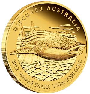 Depicting the only underwater scene of the series, the Whale Shark Proof Gold Coin shows the shark swimming in the ocean. Underneath the creature is the inscription of "WHALE SHARK" which is joined by "DISCOVER AUSTRALIA," "2012," "9999 GOLD," the size of the strike and the Perth Mint’s historic "P" mint mark on the reverse.