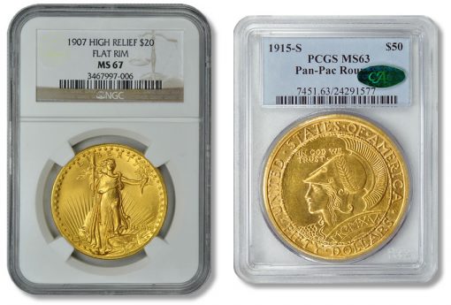 Less than 10 years after the Saint-Gaudens High Relief was issued, San Francisco held the Panama-Pacific Exposition and released a set of coins to commemorate the event. Two of the coins were $50 pieces, containing more than two ounces of gold and are highly sought-after today. Only 483 sets exist of the $50 pieces, which were issued round in design as well as octagonal. At the time of issuing this press release, a bid was already received on the round $50 piece, graded PCGS MS-63 CAC at $72,500.