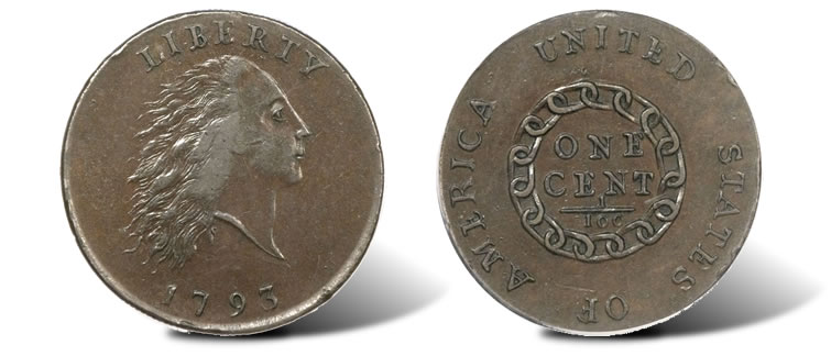 1793 Chain cent, AMERICA reverse, S-2, AU55 PCGS Secure: Only minor wear is present on this Chain cent more than two centuries old, one of the earliest coins minted by the U.S. for general commerce. From The Colorado Springs Collection.