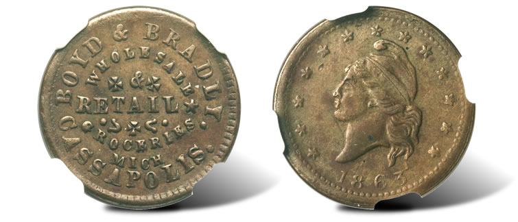 Beyond Platinum Night, the auction has one of the most extensive specialized collections Heritage has handled: The Clifton A. Temple Collection focuses on private tokens struck during the Civil War in Michigan, usually with designs promoting the business of the issuer. One of the most important tokens in the collection is an 1863 Boyd & Bradly Token, AU55 NGC. Boyd & Bradly, grocers, were the only merchants known to issue a Civil War token for the tiny town of Cassopolis, MI. Only about 10 examples are known in all grades, and token enthusiasts who collect by city, a popular subspecialty, find towns such as Cassopolis particularly challenging.
