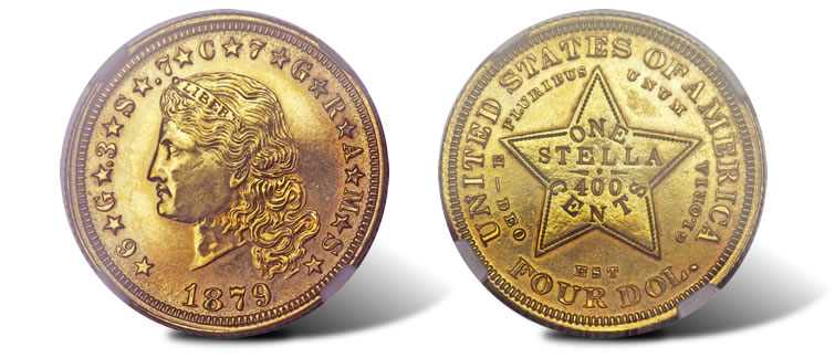 The proof four dollar gold pieces, or "Stellas," in the auction are the perfect illustration of this mix. There are three of the famous patterns in the auction, two of the familiar Judd-1635 1879 Flowing Hair type in gold. The finer of those two, is graded PR64 by PCGS.