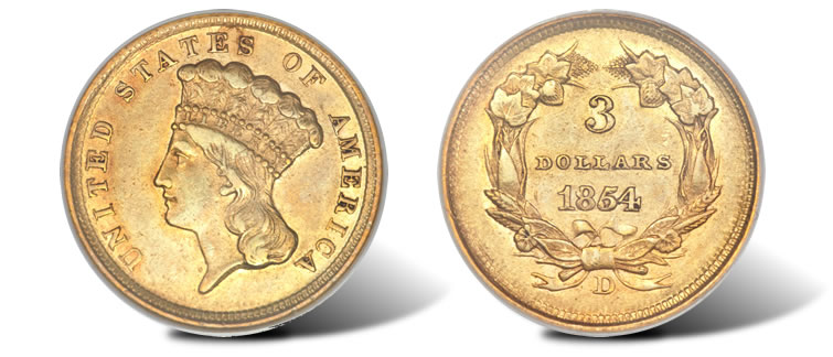 Another popular gold rarity is the 1854-D three dollar gold piece, which combines two quirks of the mid-19th century U.S. Mint: a facility in Dahlonega, Georgia, that only struck gold coins and the slightly surreal "odd denomination" of three dollars. Dahlonega struck the three dollar coins in 1854 only, producing just more than a thousand of them, with fewer than 100 surviving today. Lot 4921, graded AU58 NGC, CAC, comes from a Featured Collection of the auction, The Robert Dorsey Smith Collection.