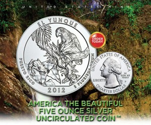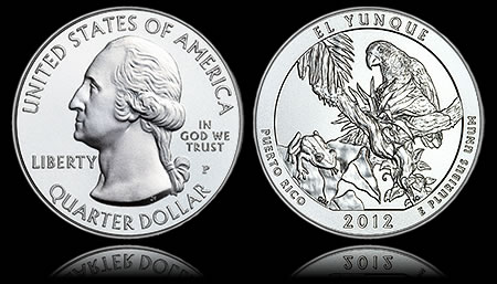 At noon Eastern Time today, May 29, the United States Mint began offering the 2012-P El Yunque National Forest Five Ounce Silver Uncirculated Coin for $204.95, the same price as the 2011-dated issues that are still available. This latest collector piece honors the national forest located in Puerto Rico.