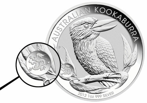 The special dragon privy mark is found to the left of the bird. Reverse inscriptions on the coin include "Australian Kookaburra" and "2012 1 oz 999 Silver."