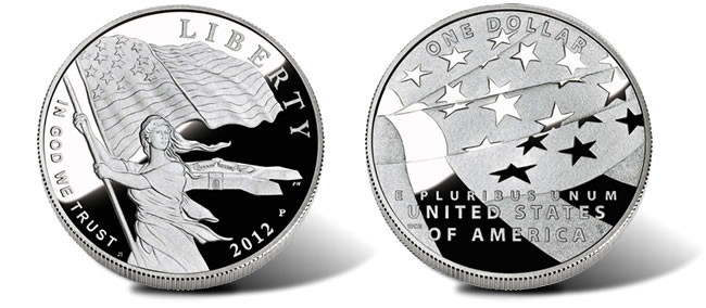 Created by Joel Iskowitz and sculpted by Phebe Hemphill, the obverse silver dollar design depicts Lady Liberty waving the Star-Spangled Banner flag with Fort McHenry in the background. Inscriptions include LIBERTY, IN GOD WE TRUST and 2012.