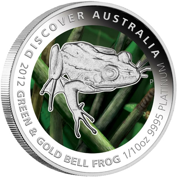 The Green and Gold Bell Frog Platinum Proof Coin depicts one of the amphibians resting on green reeds. While the background habitat is in color, the frog is depicted in the silver hue of the platinum coin itself.