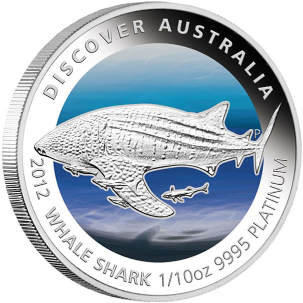 The only underwater scene of the series is found on the Whale Shark Platinum Proof Coin. It depicts the whale shark swimming in the blue ocean waters.
