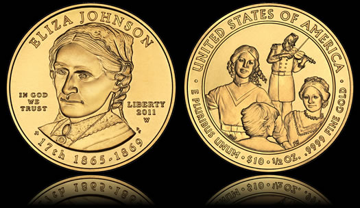 Featuring a portrait of Eliza Johnson, the 24-karat gold uncirculated coin honoring the First Lady was taken off sale today, June 5, 2012, by the United States Mint.
