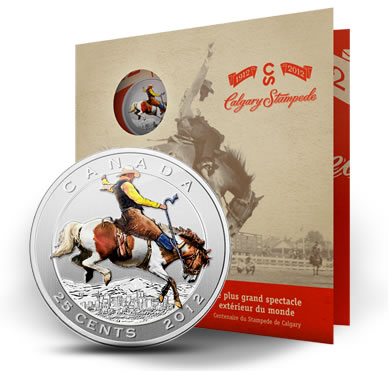 Customers eager to collect a colourful and affordable memento of the 100th Calgary Stampede should hurry to corral this 2012 25-cent Coloured Coin and Stamp Set, as limited quantities are available at the retail price of $25.95 CAD.