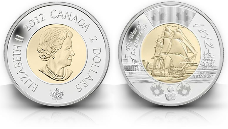 The first in a series of five War of 1812 commemorative coins launched into Canadian circulation earlier this week. The 2012 $2 HMS Shannon Commemorative Coin debuted on June 18, 2012 and acknowledges the important place the Royal Navy ship holds in the history of the conflict.