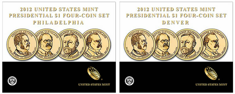 These sets contain the 2012 Presidential $1 coins featuring the 21st through 24th Presidents of the United States — Chester Arthur, Grover Cleveland (first term) Benjamin Harrison and Grover Cleveland (second term).