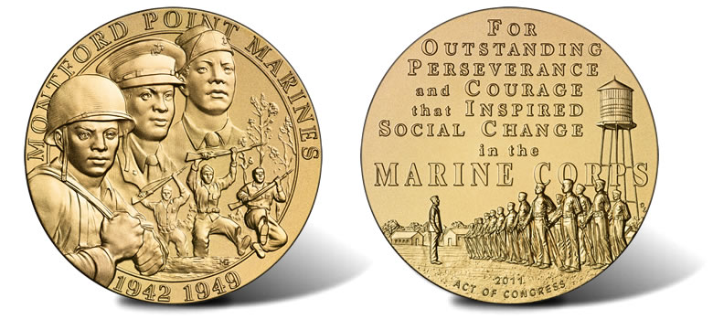 The reverse portrays the marines in formation during training, with buildings and a tall water tower in the background. Above the Marines are the inscriptions, "FOR OUTSTANDING PERSEVERANCE and COURAGE that INSPIRED SOCIAL CHANGE in the MARINE CORPS," and at the bottom more inscriptions are, "2011" and "ACT OF CONGRESS." The reverse was designed and sculpted by Don Everhart, United States Mint Sculptor-Engraver.