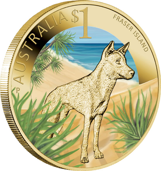 The Fraser Island $1 Coin offers a colored representation of the sandy shoreline of the island located along the southern coast of Queensland, Australia. An Australian Dingo serves as the symbol of the wildlife of the island for the reverse of the coin.
