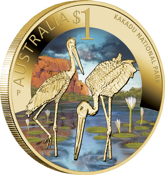 Depicted on the reverse of the Kakadu National Park $1 Coin is the water-filled landscape of the Northern Territory of Australia national park. Shown as well are two Black Necked Storks and White Snowflake Water Lilies.