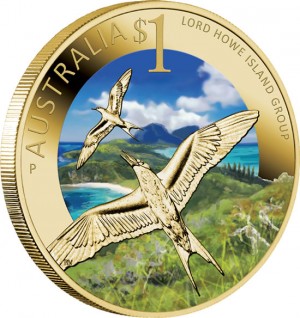 Shown on the Lord Howe Island Group $1 Coin is a green and blue image of the landscape of the islands found between Australia and New Zealand. Two sooty terns are shown in flight as well on the reverse of the coin.