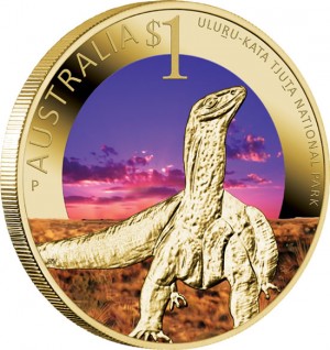 The Uluru-Kata Tjuta National Park $1 Coin shows a native Perentie Lizard on the reverse. A colorized depiction of the national park located in the Northern Territory of Australia is shown behind the lizard.