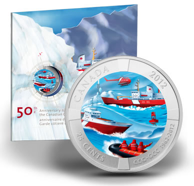 Additionally, available for shipment later this year but on sale now is a 25-cent coloured coin that honors the Canadian Coast Guard. It features striking images of red and white vessels and aircraft.