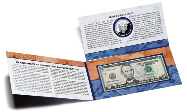 To commemorate the 150th anniversary of the Bureau of Engraving and Printing and the 220 years for the United States Mint, the Making American History Coin & Currency Set includes a 2012-S Proof American Silver Eagle and a Series 2009 $5 note beginning with a serial number of "150."