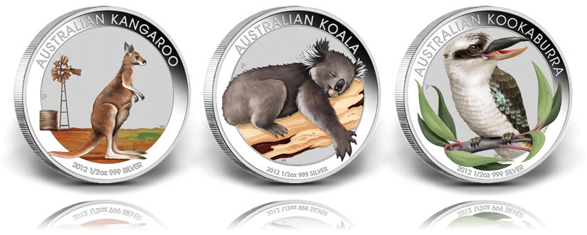Each reverse contains inscriptions identifying the depicted creature with "AUSTRALIAN KANGAROO," "AUSTRALIAN KOALA" or "AUSTRALIAN KOOKABURRA," plus "2012 1/2 oz 999 SILVER". The Perth Mint’s ‘P’ mint mark is found on the reverse to the left of each design.