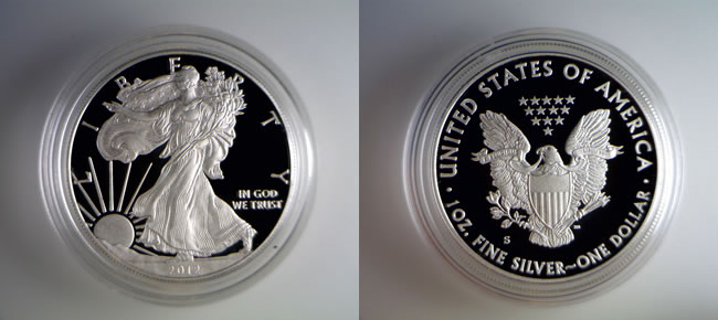 The 99.9% fine 2012-S Proof Silver Eagle, although unique for the year with its San Francisco ‘S’ mint mark, does not physically feature any anniversary elements. It was also placed within another set sold earlier this year, the 2012-S Silver Eagle Two-Coin Proof Set, which has tarnished at least some of its anniversary-intended appeal.
