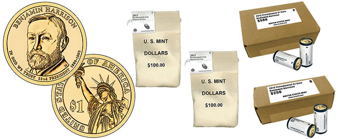 2012 Benjamin Harrison Presidential $1 coin rolls, bags and boxes are available from the Mint’s online store through this page.