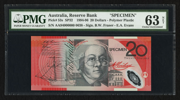 The Australian offering includes a set of Polymer Bank Note Specimens along with other very rare "Type Two" Specimens. Among them is an Australia Reserve Bank 20 Dollars ND (1994-1996) Pick 53s McDS32, in polymer, featuring a vignette of Mary Reibey, whose story is the very embodiment of Australian history.
