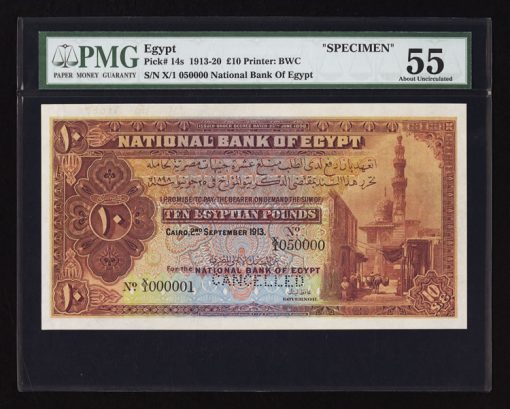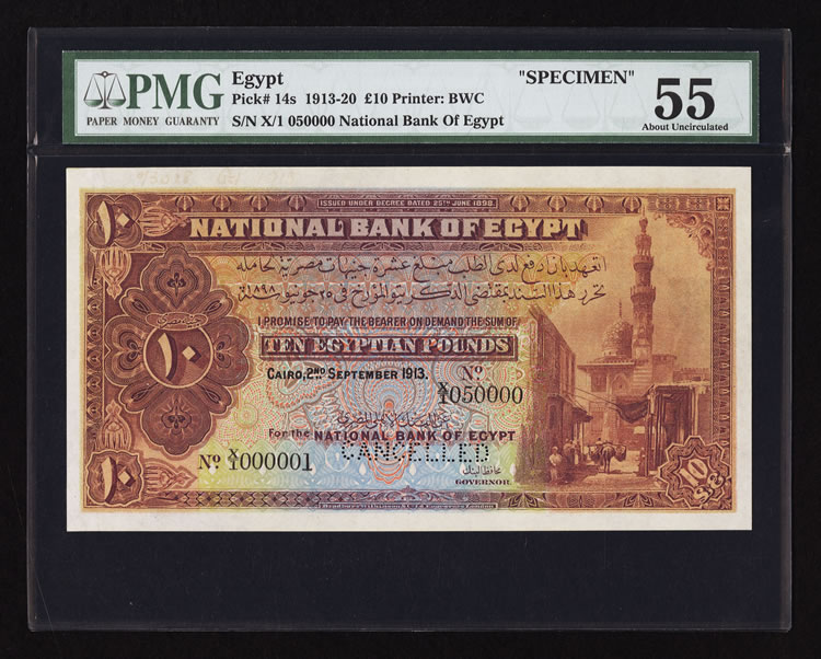 Egypt National Bank of Egypt £10 2.9.1913 Pick 14s Specimen: A rare Specimen. It was an unsigned regular issue note with serial number X/1000001 X/1050000 and it was perforated "Cancelled" at back lower center. PMG About Uncirculated 55. Estimate: $15,000+.