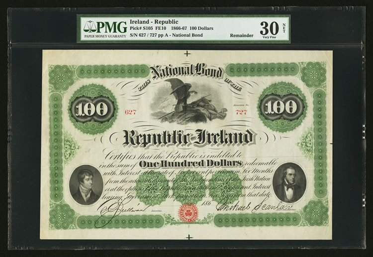"The eagle with sword vignette at top of this note has the words ‘Irish Independence’ running across it," said Johnston. "That makes this a very poignant note; Ireland would not achieve independence from British rule until 55 years after this note’s 1866 production."