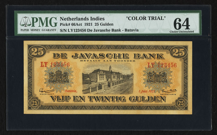 Netherlands Indies De Javasche Bank 25 Gulden 1.6.1921 Pick UNL Color Trial: This previously unknown 25 Gulden denomination is unlisted for the 1919-1921 Netherlands Indies issue. Gem size margins frame this beautifully printed piece which features red serial numbers and red date with the issuing city of Batavia also in red. PMG Choice Uncirculated 64.Estimate: $6,000+.