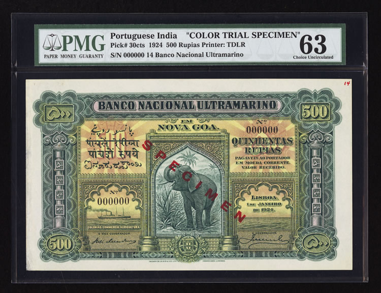 Portuguese India Banco Nacional Ultramarino 500 Rupias 1.1.1924 Pick 30cts Jhunjhunwalla-Razack 12.20.1 Color Trial Specimen: A nicely preserved piece with ideal inks are found on this example of the highest denomination of the 1924 issue. This 500 Rupias note formerly resided in a specimen book and was removed with care. Certainly, a noble note for crowning this exquisite Banco Nacional Ultramarino third issue collection. PMG Choice Uncirculated 63. Estimate: $10,000+. Specimen examples of the other denominations from the 1924 issue are also being offered.