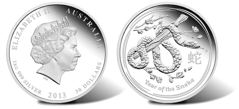 Four different 2013 Year of the Snake Silver Proof Coins are available from the Perth Mint. The four sizes include 1 kilo, 2 ounce, 1 ounce and 1/2 ounce.