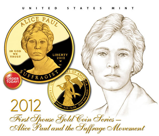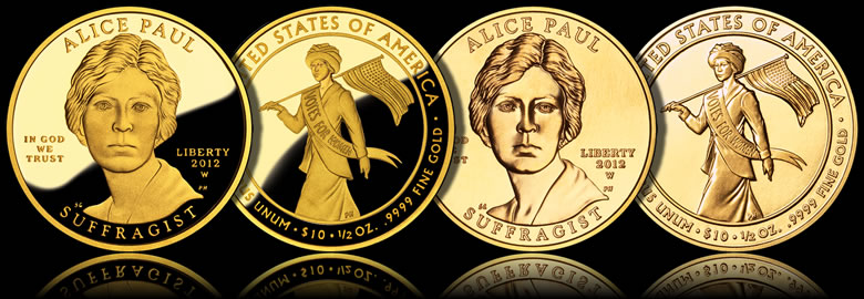 2012 Alice Paul and the Suffrage Movement Gold Coins were released by the United States Mint on Thursday, October 11, 2012. These collector coins honoring Paul are composed from 1/2 ounce of 99.99% pure gold.
