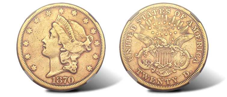 An 1870-CC double eagle, XF40 NGC, realized $193,875. It comes from the first year of coinage at the legendary Carson City Mint in western Nevada. Only a few dozen survivors are known to exist.