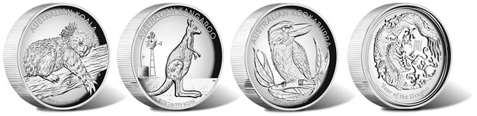 Found in the four-coin set are examples of the 2012 Kangaroo Silver High Relief Coin, the 2012 Koala Silver High Relief Coin, the 2012 Kookaburra Silver High Relief Coin and the 2012 Lunar Series II Year of the Dragon Silver High Relief Coin.