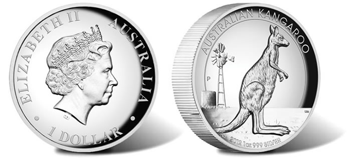 Shown on the reverse of the Kangaroo Coin is the 2012 Australian Kangaroo Silver Coin design as created by Perth Mint artist Wade Robinson. This coin originally debuted individually from the Perth back in July. It depicts the kangaroo in a traditional bush scene with a windmill and water tank shown behind the marsupial.