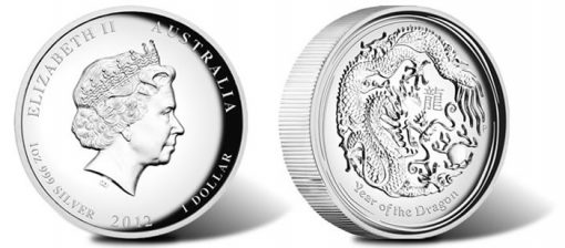 Finally, the 2012 Year of the Dragon design is featured on the fourth coin in the collection. The mythical creature is shown curled around the edge along with a symbolic representation of the ‘pearl of wisdom’ and made its debut individually in March of this year.