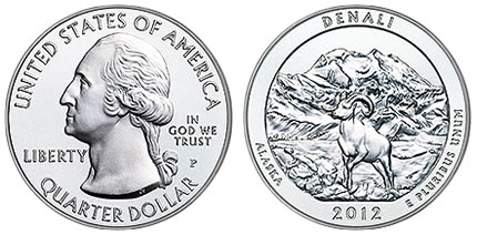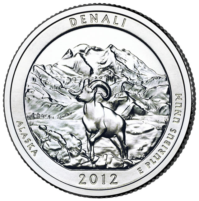 Designs chosen for America the Beautiful Quarters go through a long process before they are selected with the main criteria being the image must be emblematic of the national site. That is certainly the case with the Denali quarter. On the reverse, a Dall Sheep is portrayed in the foreground with a view of Mount McKinley behind it. Inscriptions include DENALI, ALASKA, 2012 and E PLURIBUS UNUM.