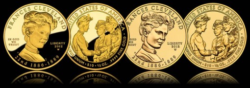 Available since Thursday, November 15, 2012, are Frances Cleveland First Spouse Gold Coins that are struck by the United States Mint to celebrate her service during Grover Cleveland’s first term as President of the United States. Mrs. Cleveland’s second term coins are expected to launch in late December.