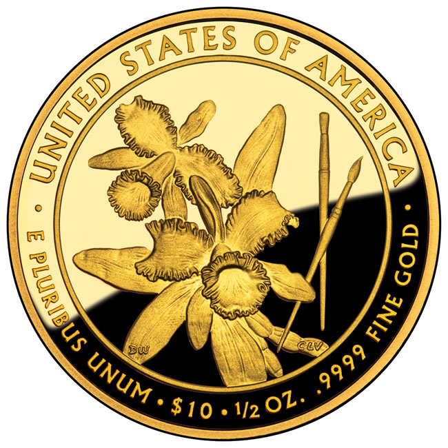 The reverse was designed by AIP Master Designer Donna Weaver and sculpted by U.S. Mint Sculptor-Engraver Charles L. Vickers. It includes the inscriptions of UNITED STATES OF AMERICA, E PLURIBUS UNUM, $10, ½ OZ., and .9999 FINE GOLD.