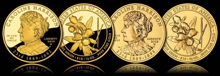The United States Mint began taking orders Thursday, December 6, 2012, for the Caroline Harrison First Spouse Gold Coins.