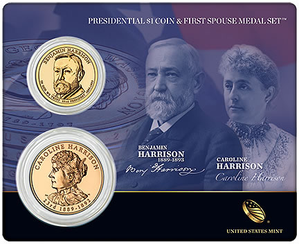 The 24-karat gold series honors the spouses of the former Presidents of the United States in the order in which the chief executive served. The program debuted in 2007 with the Harrison release marking the third of the four 2012-dated coins.