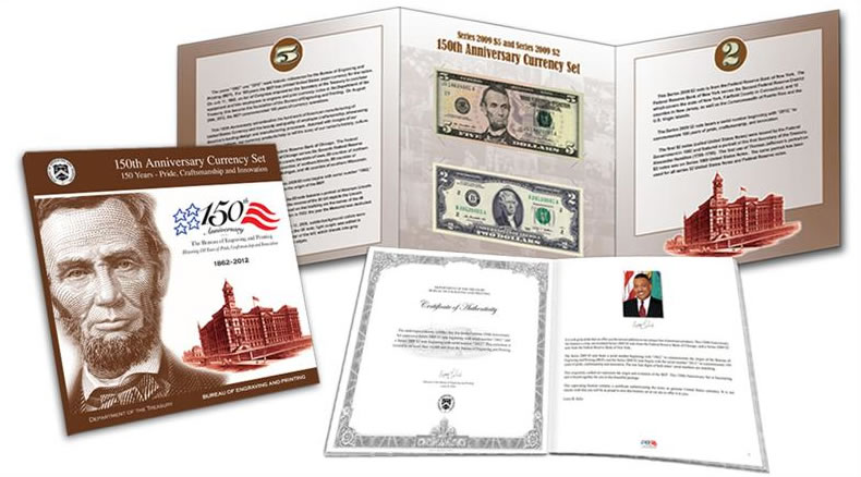 Limited to 10,000 units, the BEP’s 150th Anniversary Currency Set includes a Series 2009 $5 note from the Federal Reserve Bank of Chicago and a Series 2009 $2 note from the Federal Reserve Bank of New York. The $5 note has a starting serial number of "1862," symbolizing the origin of the BEP. The $2 note has a starting serial number of "2012" to commemorate the BEP’s anniversary. The last four digits of the serial numbers on both bills match.